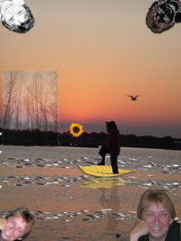 6= my sillouette. My friend Mark and i are always taking photos and sometimes get a good one of each other in action. This is one of my favorites. I used magic wand to make selection, erased a part of the leg and resized the image. Then positioned it on the leaf kayak so it looks like i am photographing the "sunset".
